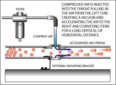 如圖, 當(dāng)壓縮空氣進(jìn)入氣動(dòng)輸送器后,通過內(nèi)部的物理結(jié)構(gòu)向右側(cè)高速噴出,而在左側(cè)形成高負(fù)壓區(qū),物料被吸入,隨壓縮空氣一起吹向右端。采用這種氣流輸送的方式,輸送啟停和速度通過調(diào)整壓縮空氣的開關(guān)和進(jìn)氣壓力來實(shí)現(xiàn),非常易于控制。
